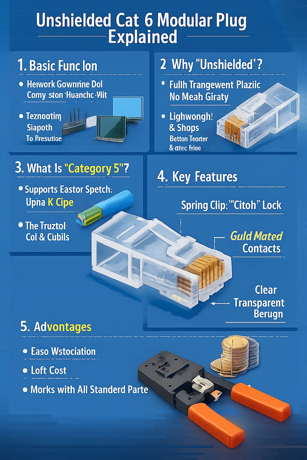 เหมาะสำหรับสภาพแวดล้อมทั่วไป: ในบ้านหรือสำนักงานทั่วไปของเรา ซึ่งไม่มีการรบกวนจากมอเตอร์กำลังสูงมากนัก การใช้ปลั๊กโมดูลาร์ Cat.6 ที่ไม่มีการหุ้มนี้มีราคาไม่แพงและติดตั้งง่าย